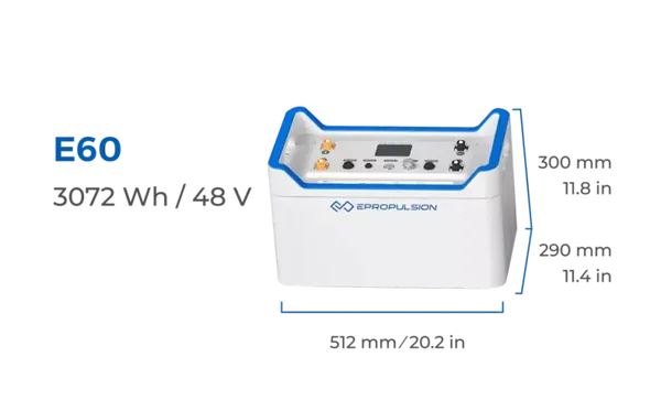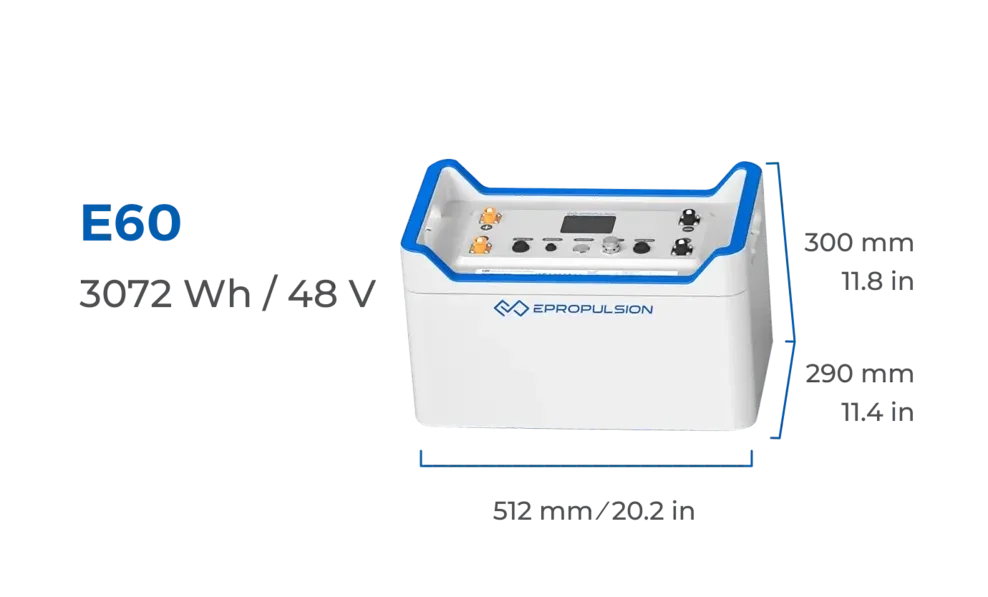 De E-serie accu E60 is geschikt voor de motoren van ePropulsion. Hij is ontworpen voor maximale efficiëntie, prestaties en veiligheid. Met 3072Wh kunt u uren varen.
