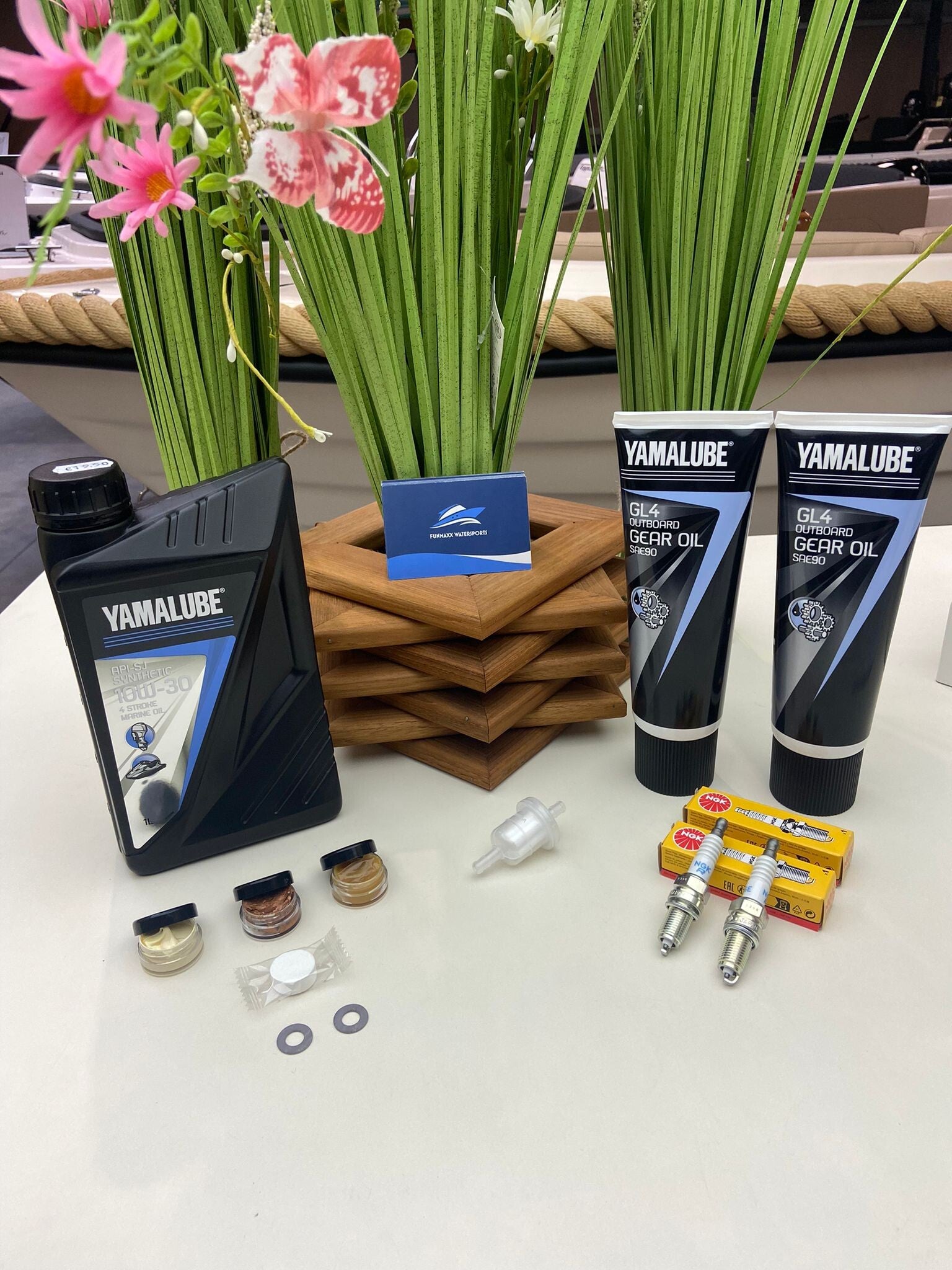 Het pakket bevat onder andere een bougie, brandstoffilter, pakkingen voor het staartstuk, motorolie en staartstukolie. Daarnaast bevat het pakket ook kopervet en Yamalube lical grease voor de knevels, wat zorgt voor een soepele werking van de motor.
