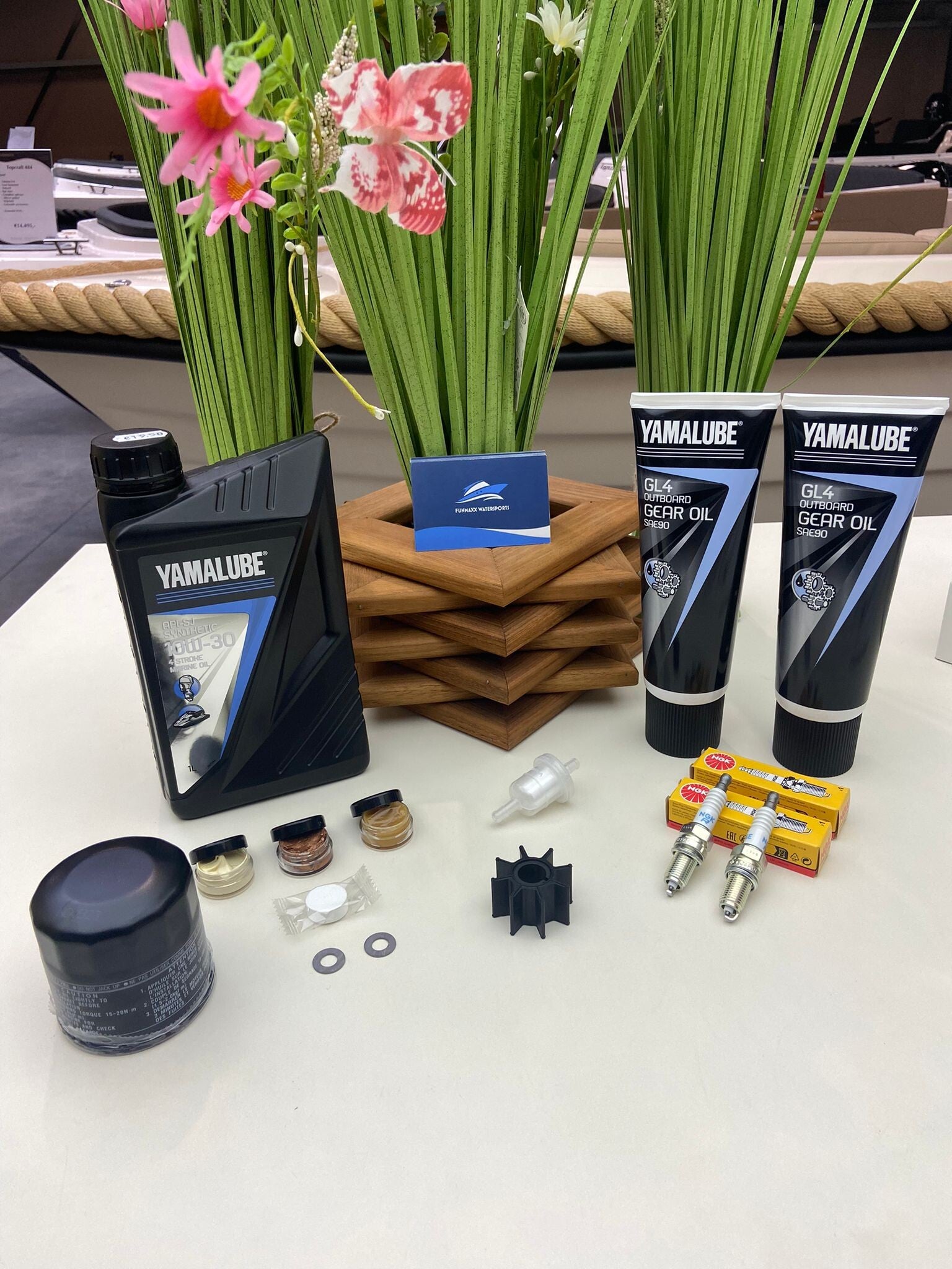 Het pakket bevat onder andere een bougie, brandstoffilter, pakkingen voor het staartstuk, motorolie en staartstukolie. Daarnaast bevat het pakket ook kopervet en Yamalube lical grease voor de knevels, wat zorgt voor een soepele werking van de motor.
